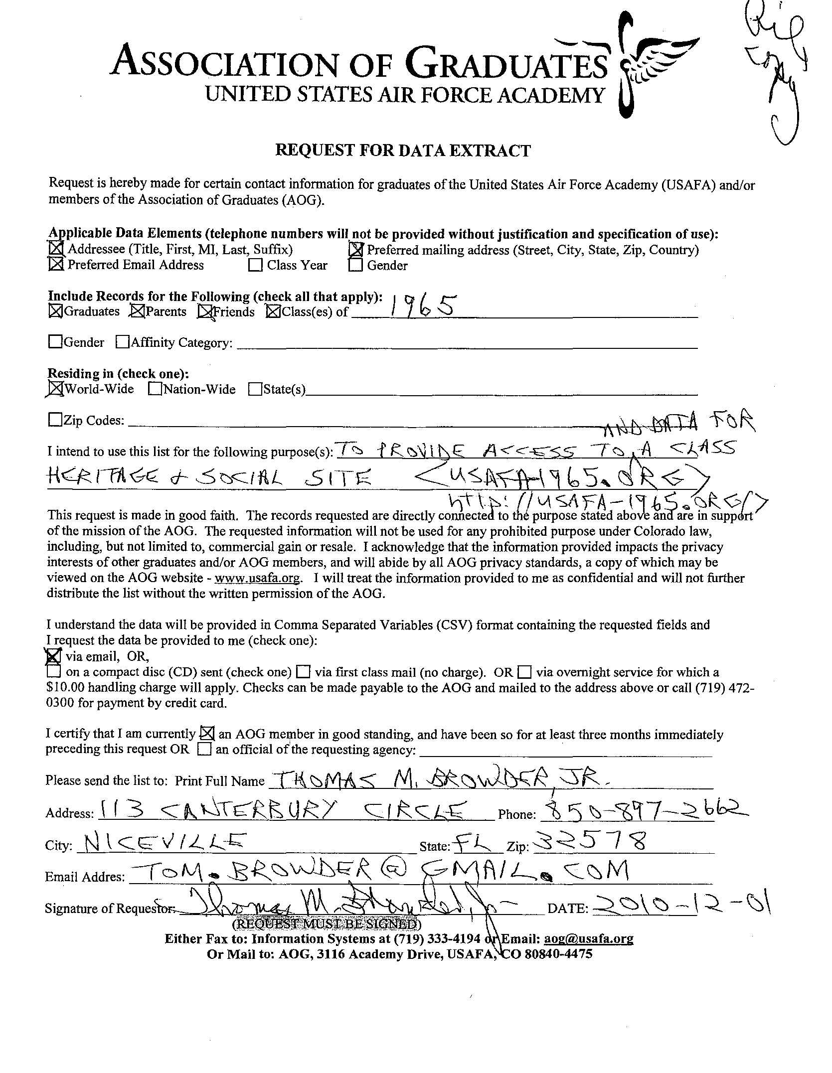 2020-04-11THE CLASSMATES MAPS ARE DOWN—SOLUTIONS BEING SOUGHT I have been using Google Maps since the beginning of this site, but their latest updates and I aren't cooperating. I have been searching for another solution for some time and think I have found the right mix in Open Street Maps for map tile sources (via commercial provider Stadia Maps until I can render my own) and Open Layers, but that won't happen overnight. 2020-02-15The AOG yesterday sent out a "last flight" notice for classmate Errol Reiner, CS-17, quote: The Association of Graduates has recently learned of the death of Lt Col (Ret) Errol G. Reiner, CS-17 class of 1965. Colonel Reiner passed away on 1 Feb 2020 in Colorado Springs, CO. A memorial service will be held on 19 Feb 2020 at 1300 hours at the Black Forest Lutheran Church; 12455 Black Forest Rd; Colorado Springs, CO 80908. A funeral service will be held on 20 Feb 2020 at 1300 hours at the USAFA Community Center Chapel. Burial in the USAFA Cemetery will immediately follow the funeral service. Condolences [sic] may be left online at https://www.dignitymemorial.com or they may be sent to his family in care of his wife, Donna: Mrs. Donna J. Reiner; 11014 Forest Creek Dr; Colorado Springs, CO 80908-7425. End quote. 2019-12-14Yesterday, the USAFA AOG announced the recipients of the Distinguished Graduate Award, and our very own Fletcher "Flash" Wiley, CS-20, was named as one of those so honored. Congratulations to Flash for his many and important achievements which earned him that prestigous selection. From the AOG announcement, quote: USAFA Distinguished Graduate Award Honorees Announced The United States Air Force Academy and the Association of Graduates are proud to announce five Distinguished Graduate Award honorees for 2019. Col. (Ret.) Leslie Denend '63; Mr. Fletcher "Flash" Wiley '65; Gen. (Ret.) Norton "Norty" Schwartz '73; Gen. (Ret.) Edward Rice Jr. '78; and Mr. John "Jack" Kucera '78 will receive their awards at the annual Founders Day banquet, Friday, April 3, 2020, at the Air Force Academy. End quote. Note the selectees "bring the total number of USAFA alumni to be honored as Distinguished Graduate awardees to 46." The program was started in 2001, and there have been over 50,000 USAFA graduates since the first class graduated in 1959. ("As of May 30, [2019], 51,691 men and women will have graduated from the Academy. That’s 45,608 men and 6, 083 women." [Ref] By my calculations, that's less than 0.1% of all graduates—a mighty select group!) 2019-12-11I just received an e-mail from the widow of our late classmate, Mike Mason, CS-24. She told me Mike died on 2019-07-25, and later had a proper burial on the grounds of his medieval home in England. Military honors were rendered by a "full honour guard from RAF Lakenheath." I do not know any other details at the moment, but I did provide her with AOG contact information if she wishes to share more details with them. 2019-12-04The AOG yesterday sent out a "last flight" notice for classmate Dave Rawlins, CS-04, quote: The Association of Graduates has recently learned of the death of Mr. David H. “Dave” Rawlins, CS-04 Class of 1965. Mr. Rawlins passed away on 28 Nov 2019 in Altoona, PA. A Celebration of Life will be held on 4 Dec 2019 beginning at 1030 hours at the Zion Lutheran Church; 500 Allegheny St; Hollidaysburg, PA 16648. His family has suggested that memorial donations be made in lieu of flowers to the "Faith Riders"; C/O Zion Lutheran Church; 500 Allegheny St; Altoona, PA 16648; (814) 695-0091. David's obituary can be found at www.myerssomersfuneralhome.com. Condolences may be left online, or they may be sent to his family in care of his wife, Jan: Mrs. Janice Rawlins; 1808 Bellmeade Dr; Altoona, PA 16602-7407 End quote. 2019-11-26.2Maps seem to back be up. Let me know via phone (see home page in the header info) if you cannot see the maps. 2019-11-26NOTE: THE MAPS STILL AREN'T WORKING. Sorry for the delay, hopefully back by this evening. 2019-11-25NOTE: THE MAPS AREN'T WORKING NOW. I had to change my Google Maps API credentials due to an inadvertent compromise of my API key, and it will be a few hours before I can fix the site. HOWEVER, please e-mail me anyway if you attempted using them because I would like to see how much the maps are used. 2019-11-18Update from the AOG on the passing of Will Burney, CS-15, quote: The Association of Graduates has recently learned of the death of Capt (Ret) Willard T. Burney, CS-15 class of 1965. Capt Burney passed away on 08 Nov 2019 in Virginia Beach, VA. Services were held on 16 Nov 2019 in Virginia Beach, VA. Condolences may be sent to his family in care of his wife, Arlis: Mrs. Arlis Burney; 2633 Wonderland Court, Virginia Beach, VA 23456-8281 End quote. 2019-11-11Another final flight: Willard Travis Burney, CS-15. I received the notice from Dennis Murphy, Class Senator, quote: I was informed by Arlis Burney (Will's widow) that he had passed away last week after a lengthy illness. Enclosed is the write-up I've passed on for a "Gone But Not Forgotten" write-up in Checkpoints. Arlis provided the following information related to funeral arrangements (please let me know if you have any questions): The service will take place at our church, Charity United Methodist Church on Saturday, November 16 th at 2 p.m. It will be closed casket, but there will be some time prior to the service (a half hour or so) if folks would like to say goodbyes next to the casket in the church sanctuary. Military honors will be rendered after the religious ceremony inside and transitioning to outside the church building. There will be a reception at the church following the service. No graveside service will be conducted. The address for the church is: Charity United Methodist Church 4080 Charity Neck Road Virginia Beach, VA 23457 We ask folks to please not send flowers. If you are so inclined, in lieu of flowers, please make a donation in Travis’ name to the Albert G. Horton, Jr. M