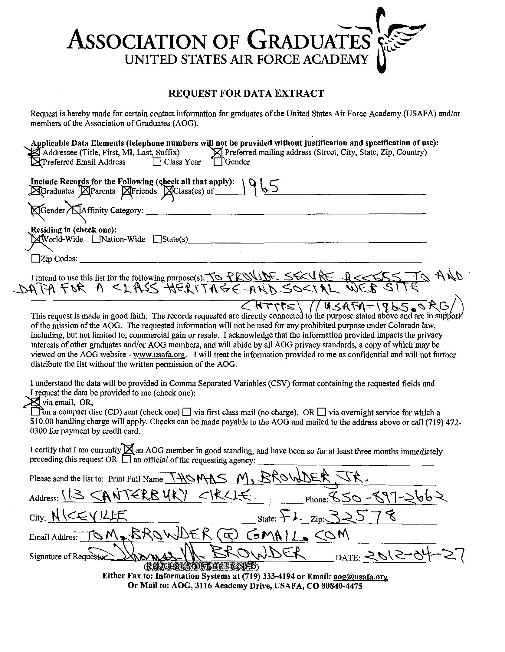 Cliff also noted that Joe O'Gorman had died, but no date is known. Anyone? I've added a copy of the form I had to sign to get all classmate data from the AOG. As you can see, it hasn't been exposed in the wild (see the "AOG Data Request Form" link at the top). You will be able to get access when I get all the controls in place. (The form is a tif file, so you may not be able to view it unless you have the proper viewer program installed. Windows users should have no trouble.) 2011-08-16Cliff Patrick, CS-23, pointed out that Jody Powell, CS-09, died last decade but wasn't sure of the date. According to Wikipedia it was 2009-09-14. Cliff also noted that Joe O'Gorman had died, but no date is known. 2011-08-15Ron Bailey, CS-22, volunteered for the map. Now listed are:
